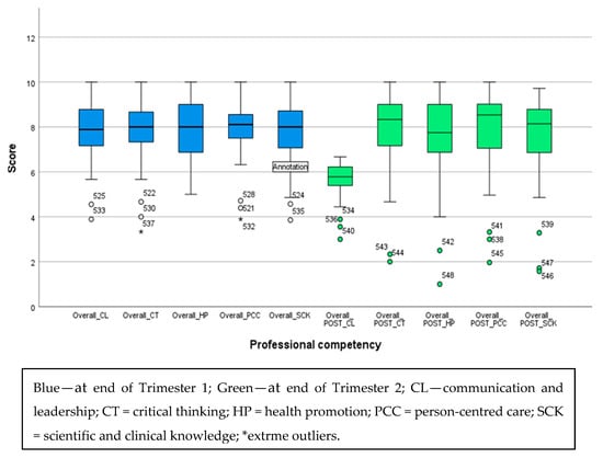 Sociodemographic characteristics showed a significant association with professional competencies (Table 2 and Table 3). At the end of T1, there was a significant difference in CT and CL between students with a previous tertiary degree and those without, p < 0.05. Students with a previous tertiary degree reported a higher median level of confidence in CT (n = 26, 38.2%) and CL (n = 25, 36.8%) than students without a tertiary degree (n = 13, 19.1%; n = 12, 17.6%, respectively).