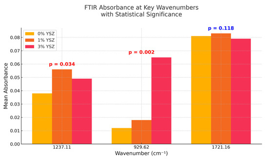 Peak absorbance values were extracted at the most relevant wavenumbers: 1721.16 cm−1 (C=O stretch), 1237.11 cm−1 (C–O stretch), and 929.62 cm−1 (Zr–O vibration). Three replicates for each experimental condition (0%, 1%, and 3% YSZ) were measured, and the mean ± standard deviation (SD) was calculated for each group.