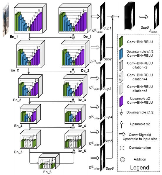 Semantic segmentation involves the assignment of a classification label to the individual pixels within an image. For the purpose of classifying pixels as belonging to either pulp, pulp stone or background, the U2-Net architecture was used, which is an extension of the U-Net model. U2-Net uses what is called an encoder−decoder architecture. Semantic information is captured by the model via the encoding path (or down convolution), whereas spatial information is recovered via the decoding path (upsampling). In this way, high-level semantic information can be effectively captured by U2-Net, while also ensuring that all spatial details required to accurately classify pixels are still preserved (Figure 1 and Figure 2). One of the issues in panoramic radiography segmentation is the difficulty of capturing small, low-contrast objects such as pulp stones among complex surrounding structures. U-Net has proven effective for many segmentation tasks; however, its single-scale expansion and contraction path can struggle with fine details. U2-Net addresses this by stacking multiple U-shaped modules at different scales, providing even deeper supervision and more nuanced feature extraction without drastically increasing the model size. This design is particularly suitable for panoramic images, where subtle differences in grayscale intensity can greatly affect segmentation accuracy.
