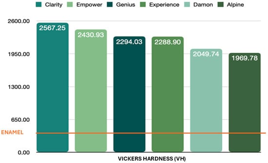 Ideally, the hardness of orthodontic brackets should be less than that of enamel to avoid wear phenomena affecting the opposing teeth [6]. However, the hardness of that bracket should be sufficiently high at the bracket wings to avoid plastic deformation and thus enable the bracket to support and transmit forces generated by the orthodontic archwire that cause tooth movement. The hardness of the bracket’s base should also be lower than that of the wings and the enamel to facilitate bracket removal [7].