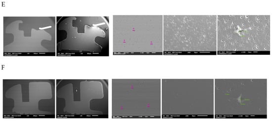 The different bracket types viewed using the SEM (×30/×500) and the locations at which their chemical composition was with visualization of indenter in green. (A) Alpine SL® Clear (RMO, Denver, CO, USA). (B) Clarity® Ultra (3M, Monrovia, CA, USA). (C) Damon® Clear 2 (ORMCO, Glendale, CA, USA). (D) Empower® 2 Clear (AO, Sheboygan, WI, USA). (E) Experience Ceramic® brackets (GC, Breckerfeld, Germany). (F) Genius® Crystal brackets (Orthopartner, Tainan City, Taiwan).