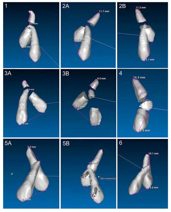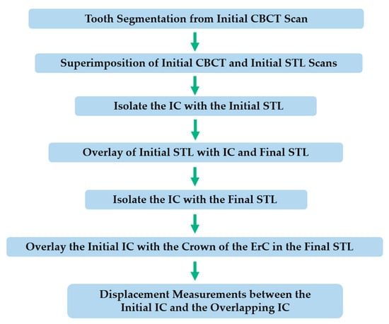 Out of the total sample, 8 cases had both STL scans and final CBCT available for comparison. In some cases, performing a CBCT scan at the end of treatment was not justified. Then, the possibility of measuring canine displacement at the tip and apex using another method was evaluated. This procedure was divided into five main steps, as described below. A diagram was created to better illustrate the sequence of the method (Figure 1).