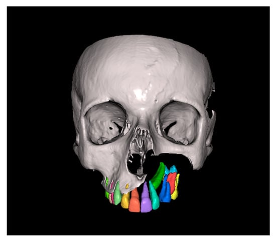 Since the IC is not visible in the initial STL, it was necessary to know its three-dimensional location. As performed in the other method, the initial CBCT scan (Figure 2) was opened in the program, and all teeth were segmented. Although Figure 2 shows the skull model, only the teeth segmentation is necessary for this method. A small cut was made to allow visualization of the IC (Figure 3).