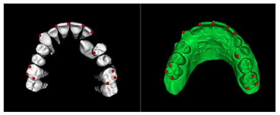 In this step, the segmented teeth from the initial CBCT scan were superimposed onto the initial STL file. This was achieved by marking corresponding points on several teeth throughout the dental arch, ensuring accurate alignment (Figure 4). Despite the morphological differences between the CBCT and STL models, particularly related to the canine region, as the permanent canine was still impacted and therefore visible only in the CBCT, corresponding anatomical landmarks were carefully selected on both models to enable accurate superimposition and comparison. The deciduous canine is only visible in the intraoral scanner data, as it was not segmented and included in this figure despite being present in the CBCT (Figure 4).
