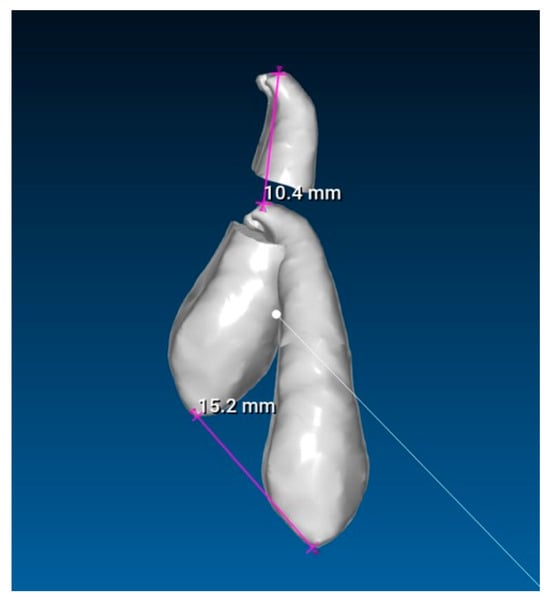 Since the final STL does not include tooth roots, only the crowns of the initial and final canines were overlapped. This alignment positioned the canine in its final position after traction. In some cases, after overlapping, the apex of the canine was not visible (Figure 8). When this occurred, a small cut was made to enable visualization of the apex.