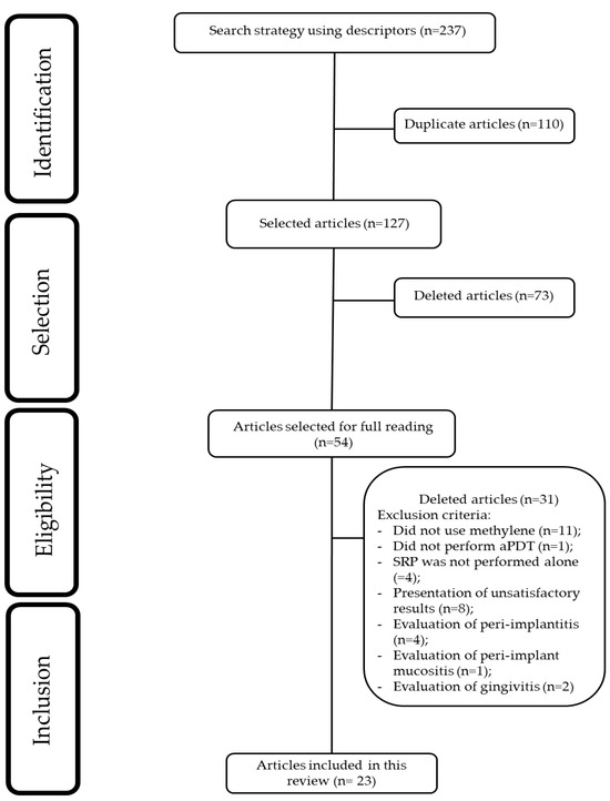 As a result of the database search using the descriptors ‘periodontal disease and antimicrobial photodynamic therapy,’ 123 articles were retrieved, and with ‘periodontitis and antimicrobial photodynamic therapy,’ an additional 114 articles were identified. In total, 237 potentially relevant articles were found. Duplicate records (n = 110) were removed using the Rayyan platform. After screening titles and abstracts, 73 articles were excluded based on relevance, and 54 were selected for full-text assessment. Following a detailed evaluation, 30 articles were excluded with justification. Ultimately, 23 articles met the eligibility criteria and were included in this review. The selection process of the articles is illustrated in Figure 1.