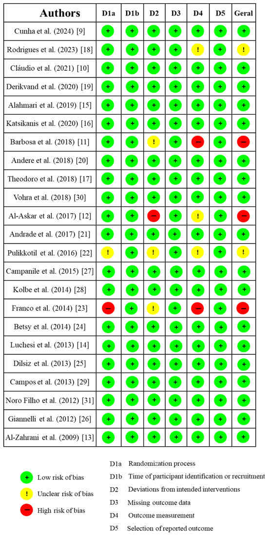 All the studies selected for this review underwent a risk of bias assessment. This assessment was conducted using the Cochrane Risk of Bias tool for randomized trials (RoB 2.0), which considers five domains: (D1) Randomization process and timing of participant identification or recruitment; (D2) Deviations from intended interventions; (D3) Missing outcome data; (D4) Outcome measurement; (D5) Selection of reported outcomes. Based on the analysis of these studies, they were classified as having high risk of bias (+), low risk of bias (−), or unclear risk of bias (!).