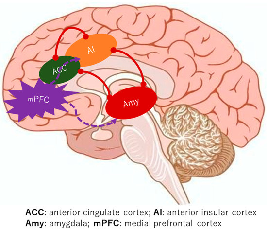 A consistent finding across the studies is the augmented functional connectivity within the medial pain system in BMS patients, encompassing key regions such as the mPFC, ACC, IC, Hc, and AMY [9,10,11,12,13,14]. Notably, the lateral pain system, including the somatosensory cortex, did not show similar discrepancies when compared to healthy controls [5,6,7]. The brain’s intricate functional networks, which govern everything from sensation to emotion, appear to be significantly reconfigured in BMS. A critical aspect of this re-wiring involves the salience network, a key functional brain network formed by the connectivity between the ACC and the IC [18]. This network is crucial for detecting and directing attention towards both external stimuli and internal bodily changes. In BMS, the robust functional connectivity of the salience network, particularly with emotional processing areas like the AMY, suggests a heightened sensitivity to internal signals (Figure 2). This heightened connectivity may lead to the perception of innocuous stimuli as significant changes, potentially triggering or intensifying the experience of pain. This characteristic of enhanced salience network activity and its strong connections to emotional circuits is also observed in other chronic pain conditions like fibromyalgia, hinting at a common neural signature for such disorders [19]. Furthermore, the strengthened connectivity between the salience network and memory-related regions, such as the Hc, offers a compelling explanation for the persistence of chronic pain even in the absence of ongoing noxious stimuli. It is plausible that past oral habits or painful dental procedures could have irritated trigeminal nerves, serving as an initial trigger [20]. The brain, particularly the IC, appears to store “molecular memories” of painful inflammation, and activation of the salience network might trigger the replay of these past painful experiences [21]. This suggests a mechanism where previous pain experiences alter neural connectivity, creating a robust circuit between the salience network, the AMY, and the Hc, thereby facilitating the regeneration of pain sensations.