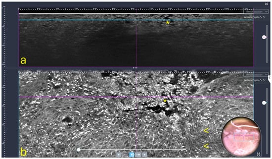 Figure 2. LC-OCT of the marginal interdental gingiva in a patient with periodontitis: vertical (a) and horizontal (b) sections showing epidermal disruption and erosions (*) and inflammatory cells (arrows). Insert: dermoscopic aspect of the examined area.