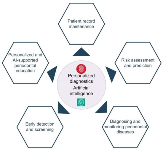 - Pitchika, V.; Büttner, M.; Schwendicke, F. Artificial Intelligence and Personalized Diagnostics in Periodontology: A Narrative Review. Periodontology 2000 2024, 95, 220–231. [Google Scholar] [CrossRef]