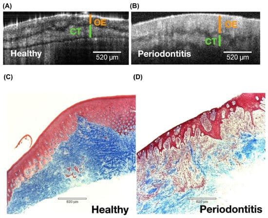 μOCT-histology correlative analysis of epithelium and connective tissue compartments of human gingiva. Representative μOCT images of excised gingival samples depicting oral epithelium (OE) and connective tissue (CT) compartments in health (A) and periodontitis (B). The corresponding Masson trichrome stained slides showing the OE (pink/red) and CT (blue, collagen) in health (C) and periodontitis (D). Significantly less collagen and more cell infiltration are noted in CT of periodontitis lesion scale bar, 520 μm. From [28] with permission.