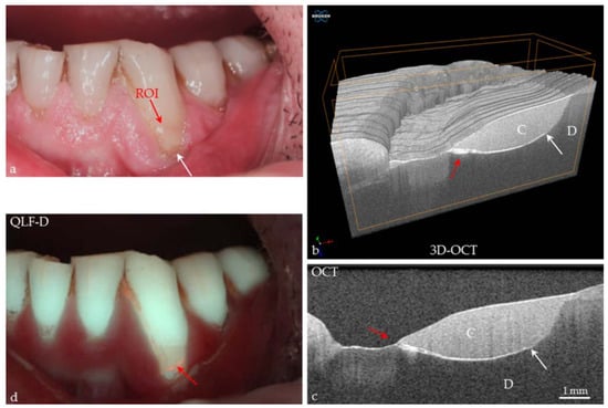 Canine tooth in vivo. (a) A cervical composite restoration (C) shows a margin of discoloration (white arrow); (b,c) in the 3D and 2D OCT images, a margin gap with an ingress of material is detected (red arrows). At dentin (D), an extensive interfacial gap has formed (white arrows); (d) using quantitative light-induced fluorescence, the image shows red fluorescence (red arrow) at the cervical restoration margin, indicating bacterial activity by porphyrin invasion into the gap. There are no signs of “secondary caries” at the restoration margin, but the stability of the situation requires observation over time (monitoring). From [88] under the terms of Creative Commons Attribution (CC BY) license.