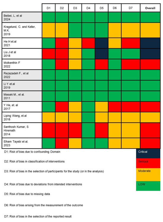 Risk of bias analysis result using ROBINS-I V2 [33,41,42,43,44,45,46,47,48,49,50,51].