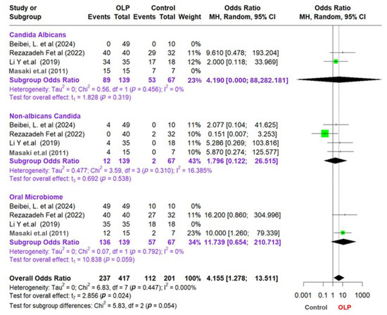 This study of meta-analysis provides information on the relationship between OLP, Candida, and the oral microbiota. The result shows that the subgroup analysis focusing on Candida albicans yielded an odds ratio (OR) of 4.19; however, this result was not statistically significant (p = 0.319). The low level of heterogeneity observed in this subgroup (I2 = 0%) suggests a uniformity across the studies examined. Conversely, the non-albicans Candida subgroup also presented insignificant findings, with an OR of 1.796 (95% CI: 0.122–26.515; p = 0.538) and a low heterogeneity level (I2 = 16.385%). These results emphasize the need for further research to clarify the role of Candida in OLP and its implications for oral health.