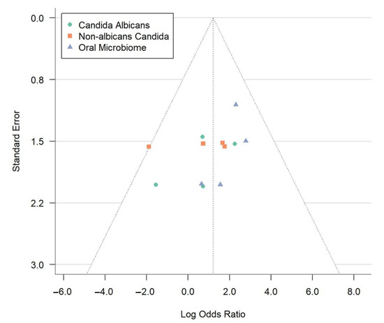 The image depicts a funnel plot (Figure 4), a crucial instrument in meta-analyses that helps identify publication bias and study heterogeneity. This plot shows how each study’s standard error (y-axis) relates to the log odds ratio (x-axis). Each point represents a study, grouped into three categories: Candida albicans (green circles), non-albicans Candida (orange squares), and the oral microbiome (blue triangles). A lower standard error means more precise estimates. The log odds ratio measures the link between OLP and microbial factors. The vertical line at a log odds ratio of 2.0 represents the overall effect size from the meta-analysis.