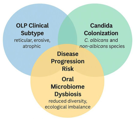 Figure 5 shows the synthesizes of the interaction between oral lichen planus (OLP) clinical subtypes, Candida colonization, and oral microbiome dysbiosis, and their potential collective contribution to disease progression. Erosive and atrophic OLP subtypes are particularly vulnerable to microbial colonization due to epithelial barrier disruption. Candida species (both C. albicans and non-albicans) may exacerbate inflammation in this context. Concurrent oral mycobiome dysbiosis, such as reduced diversity and dominance of pathogenic fungi, may further aggravate immune imbalance. Their intersection is proposed to increase the risk of clinical worsening, symptom persistence, and treatment resistance. The overlapping region identifies individuals at higher risk for adverse clinical outcomes, where targeted screening and adjunctive antifungal strategies may be especially beneficial.