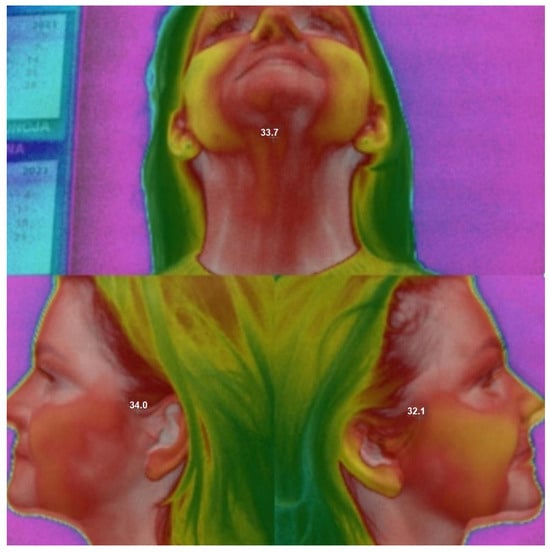 Thermography of the masseter, suprahyoid, and sternocleidomastoid muscles. The photo shows numbers indicating the temperature at the time of measurement.