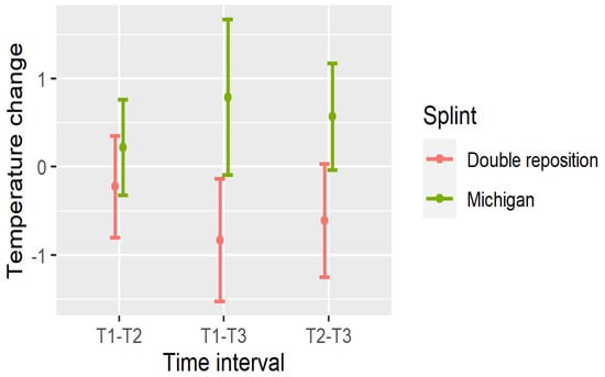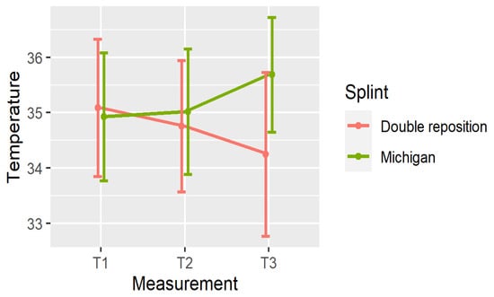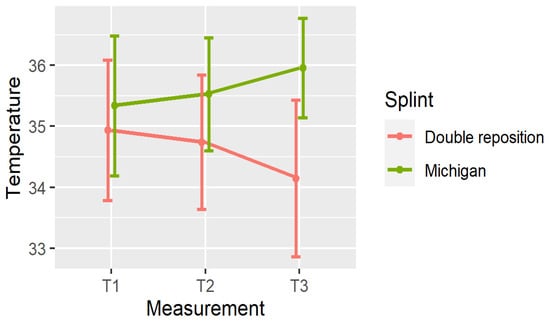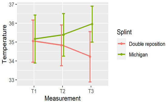 - In group M (Michigan splint), temperature consistently increased, particularly between T1 and T3.