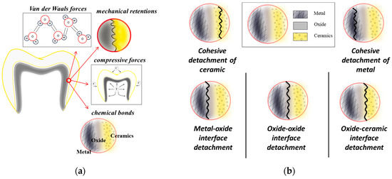 It is well known that in the oral environment, crowns and dental bridges can be subjected to different mechanical loads, like traction, compression, or shear stresses. There are several types of failure depending on the nature of the formed interfaces (Figure 1b). The debonding location can provide useful information about the adherence mechanism [4]. Usually, the fractures within the ceramic component can indicate high bond strength, while those at the oxide-oxide interface or metal-oxide can be evidence of poor bond strength between metal and ceramic. However, the predominant type of failure depends on the metal surface treatment, the compatibility of the used materials, or the thermal treatment procedures [1,5,6].