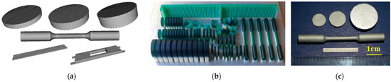 3D models designed in SolidWorks (a), printed polymeric patterns (b) and casted experimental samples (c).