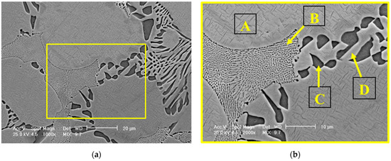 (a) SEM micrographs of NiCr alloy microstructure at 1000× magnification and (b) at 2000× magnification. The marked areas A, B, C, and D were selected for EDS analysis.