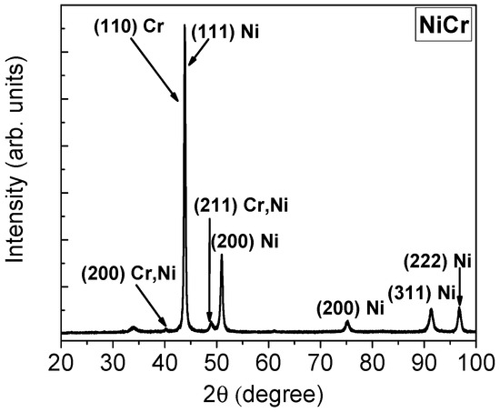 The results of the X-ray diffraction analysis for the NiCr alloy are shown in Figure 4. The diffraction peaks corresponding to the Ni element (with a face-centered cubic structure) and the crystallographic planes (111), (200), (311), (222), and (JCPDS 1-1258) were identified. Notably, the diffraction peaks observed at 2θ = 44.4° arose from the superposition of the reflections attributed to the (111) plane of Ni and the (110) plane of Cr (body-centered cubic structure, JCPDS 6-0694). Additional reflections at 2θ = 39.3° ((200) plane) and at 2θ = 48.9° ((211) plane) provided clear evidence for the formation of a Cr-Ni solid solution (JCPDS 26-0429).
