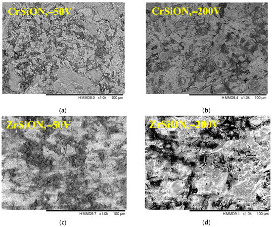 Selected mixed backscattering and secondary electron micrographs of MeSiON coatings (at ×1000 magnification) are presented in Figure 5. As observed, all the coated surfaces appeared rough and granular, indicating that the initial conditioning treatment applied before deposition (i.e., 150 μm alumina particle sandblasting) had a significant influence on the final appearance. As stated before, there are multiple studies that report surface conditioning treatments to promote surface roughness [6,13]. In the current study, a synergistic physical-chemical effect was expected. Therefore, the bond strength was improved by providing both mechanical interlocking and proper conditions for a uniform coating growth, which minimized the metal-porcelain mismatch. Their performance was further enhanced by tailoring the deposition conditions—in this case, the substrate bias. Even though there was no clearly visible compactness as a function of substrate bias, no significant difference was observed among the presented SEM micrographs, and it is well known that higher ion energy leads to an increased density and surface diffusion [28].