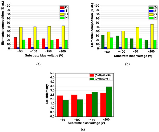 Elemental composition for CrSiON (a) and ZrSiON coatings (b); (c) stoichiometry of the investigated coatings as a function of substrate bias voltage.