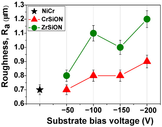 Surface roughness results are presented in Figure 7. The measurements were performed for CrSiON and ZrSiON coatings, as well as for the uncoated NiCr alloy, which served as the control. For each substrate bias voltage applied (−50 V, −100 V, −150 V, −200 V), a total of five specimens per group (n = 5) were analyzed. The results are presented as mean values accompanied by their corresponding standard deviations. One may notice relatively similar values of CrSiON coatings deposited at Vb= −50 V compared to the bare substrate (~0.7 µm), whereas a slightly higher initial value was exhibited by Zr-based oxynitride (~0.8 µm). Overall, there was a general increasing trend in the average roughness parameter Ra as a function of negative substrate bias voltage. Even though CrSiON coatings proved to be less sensitive to bias-induced surface roughening, reaching a slight increase (~0.9 µm) at −200 V, there was still an improvement compared to the uncoated NiCr substrate. Adding a functional layer imparts benefits apart from roughness, since biasing does not compromise coating quality. Moreover, it promotes adatom mobility that leads to a denser surface, as indicated by previous AFM studies [30]. On the other hand, the ZrSiON coating was more susceptible to variations in bias voltage during plasma deposition, reaching ~1.2 µm at −200 V. Similar results were reported by Niu et al., who attributed the mentioned effect to the direct correlation of ion energy and adatom mobility [31]. As a consequence, both the quantity of the formed clusters and the packing density increased [32].