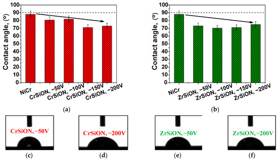 The contact angle values of a propylene glycol-based solution on the investigated surfaces are presented in Figure 8. Wettability measurements were conducted for CrSiON and ZrSiON coatings as well as for the uncoated NiCr alloy, which served as the control. For each applied substrate bias voltage (−50 V, −100 V, −150 V, −200 V), three specimens per group (n = 3) were analyzed. The results are expressed as mean values ± standard deviation. Representative images of the test liquid droplets on the sample surfaces are also included. As observed, both sets of coated specimens exhibited more hydrophilic surfaces compared to the substrate. As previously suggested, these surfaces are highly recommended for biomedical applications [33,34,35,36]. Moreover, a hydrophilic surface facilitates better interface contact and promotes a more efficient ceramic coverage and a better ceramic-metal adhesion. The values obtained can be linked with the topography of the proposed surfaces as well as the high oxygen content, which was found in the current study to be in ~40–57 at.% range.