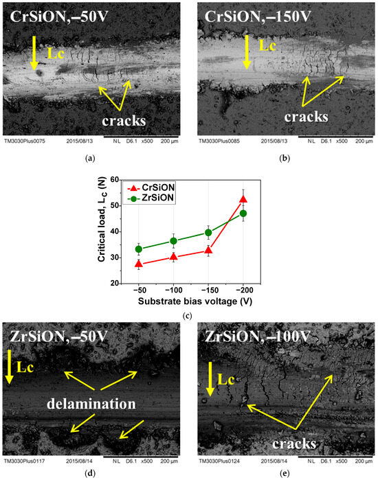 The mechanism of coating failure can be cohesive (failure occurs within the same phase) or adhesive (failure occurs within different phases). Since cracks due to cohesive failure usually appear before complete delamination at the coating–substrate interface, this phenomenon was considered as an early stage of failure. At this point, the critical load (Lc) was used as an adhesion indicator for visible cohesive cracks/partial spallation. Although researchers distinguished among multiple critical loads (i.e., Lc1, Lc2, or Lc3), the first cohesive cracking was commonly defined as the adhesion strength of the coating [37,38]. Additionally, features associated with failure mechanisms were highlighted by SEM micrographs of selected coatings (Figure 9a,b,d,e).