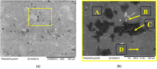 Micrographs of the ceramic component after sintering at 300× (a) and 1000× (b) magnification. The marked areas of representative A, B, C, D correspond to the selected EDS investigated by areas.