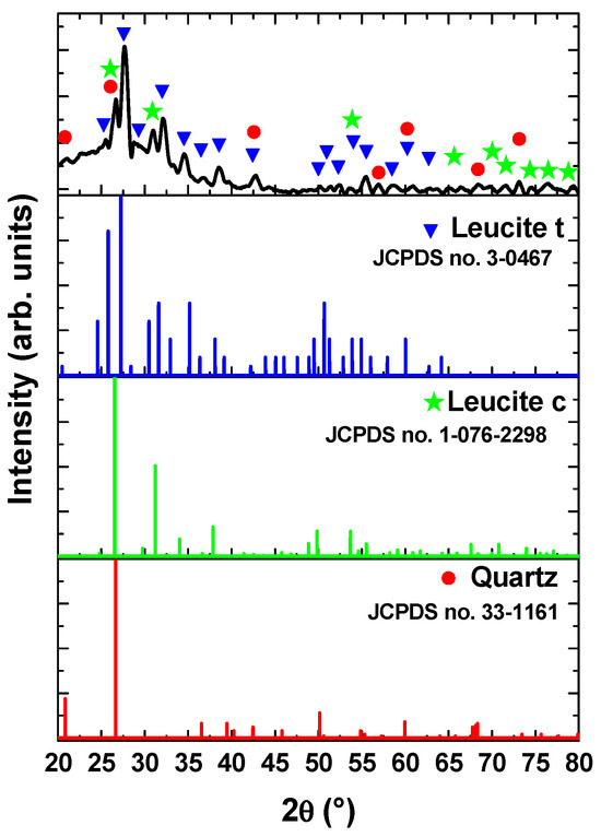 The XRD pattern of the investigated ceramic is presented in Figure 11. The results indicated the presence of the crystalline leucite phase (KAlSi2O6), which has an important role in controlling the coefficient of thermal expansion of ceramic in order to match with the metal framework, thus minimizing crack formation during the sintering process [41,42]. As indicated in the literature, the crystalline structure of the leucite phase varied as a function of sintering temperature, and its amount depended on the cooling rate [43]. In the present study, the XRD analysis indicated the predominant crystallization of the tetragonal leucite phase (JCPDS no. 3-0467), but some peaks (with relatively lower intensity) were also assigned to the leucite phase with a cubic structure (JCPDS no. 1-076-2298). This result was attributed to the transformation of the cubic structure of the leucite into a tetragonal phase at temperatures of about 620–625 °C [44]. Moreover, quartz phases with hexagonal structures were also identified according to JCPDS no. 33-1161.