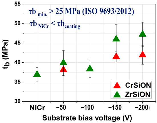 Following ceramic deposition, bond strength measurements were carried out for CrSiON and ZrSiON coatings, as well as for the uncoated NiCr alloy that served as the control. For each substrate bias voltage applied (−50 V, −100 V, −150 V, and −200 V), five specimens per group (n = 5) were tested. The results are presented as mean values ± standard deviation, as illustrated in Figure 12. The results of the three-point-bending test for the systems where MeSiON coatings were used indicated an increasing tendency of the debonding/crack-initiation strength parameter (tb) according to the negative substrate bias. Note that all of the values exceeded 25 MPa, which is the minimum requirement for bond strength specified by the ISO 9693:2000 standard [18]. Additionally, the systems where the coatings were used showed higher values compared to the control ones, mainly due to a more hydrophilic character exhibited by the coated surfaces. In this case, the obtained high values can be explained by a synergetic effect of chemical and physical factors, as follows. Based on previous observations, the elemental composition had an important contribution, since the oxygen content was directly related to deposition conditions, leading to over-stoichiometry of the obtained coatings (especially higher (O + N)/(Me + Si) ratio for ZrSiON).