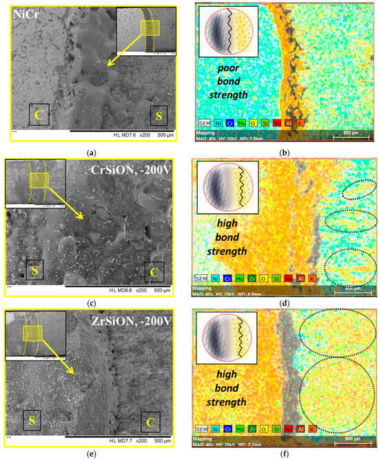 Following the mechanical loading required by the 3-point bending test, SEM micrographs and corresponding EDS mapping images of the fracture surfaces after debonding were recorded in order to assess interfacial failure modes (Figure 13). For comparison purposes, only the best-performing coatings were selected (i.e., CrSiON and ZrSiON obtained at −200 V) with uncoated NiCr-based plates used as controls. The dashed line presented in the inset (×40 magnification) separates the MeSiON-coated or uncoated NiCr area (marked with S) from the area where the ceramic layer was bonded (marked with C). Additionally, a higher magnification image (×200 magnification) highlighted the interface region where the debonding occurred (Figure 13a,c,e). To properly identify the interfacial failure modes, EDS mapping analysis was also performed (Figure 13b,d,f).