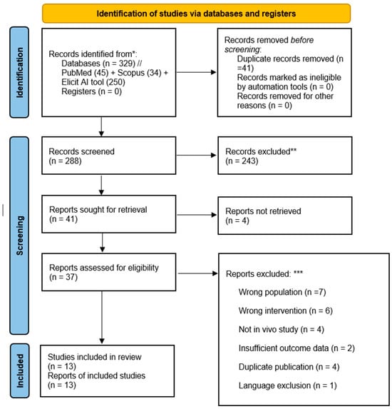 A total of 329 records were identified through searches of PubMed (45), Scopus (34), and the Elicit AI tool (250). After removing 41 duplicates, 288 unique records remained and were screened by title and abstract according to predefined eligibility criteria. Following this process, full texts of potentially relevant studies were assessed in detail, and 13 articles were finalized for inclusion in the systematic review. The complete screening and selection process is illustrated in the PRISMA 2020 flow diagram (Figure 1), and a list of excluded studies with specific reasons for exclusion is available upon request.