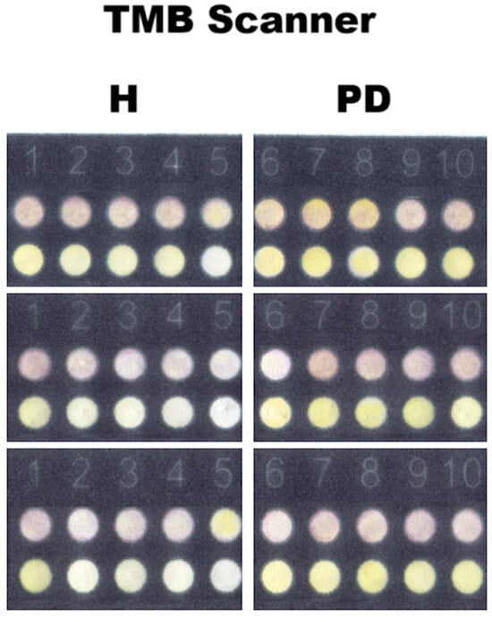- PD (n = 15)—Patients diagnosed with periodontitis stage 3 grade B (loss of clinical attachment level >5 mm; maximum of 4 teeth lost due to periodontitis; probing pocket depth ≥6 mm; periodontal loss equivalent to plaque levels; less than 2 mm of bone loss/attachment in the last 5 years).