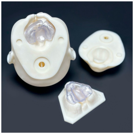 Intraoral scans from standard diagnostic procedures for cleft-lip-and-palate patients with unilateral and bilateral cleft lip and palate were anonymized and used as the basis for the designing feeding plates. After preprocessing in the diagnostic software OnyxCeph3TM (Image Instruments GmbH, Chemnitz, Germany; release version 3.2.223), digital dental models were printed. Passive plates were designed using the OnyxCeph3TM software. The 3D design files were prepared for printing and uploaded to the printer software (Asiga©, Sydney, Australia; version 2.1.0). The passive plates were then printed using an Asiga Pro 4K 3D printer, cleaned with isopropanol, and cured. Final adjustments and polishing were performed in the dental laboratory. The active plates incorporated an active element, such as a screw, and were fabricated and polished in the in-house dental laboratory. All plates, regardless of their type, fit both the corresponding maxilla of the 3D-printed phantom heads and the separately printed maxillary models (Figure 2).