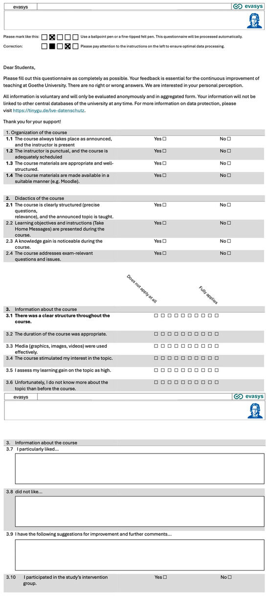 Course Evaluation: All participants in both groups (CTR and INT) completed an evaluation form after the seminar, which included yes/no questions, 10-point Likert scale items ranging from “Does not apply at all” (1) to “Fully applies” (10), and free-text fields for qualitative feedback. While the free-text responses provided valuable qualitative insights, only the quantitative data were included in the descriptive statistical analysis. The evaluation form is shown in Figure 3, with additional questions for the INT group presented in Figure 4. The evaluation questionnaire was developed in collaboration with J. W. Goethe University Frankfurt am Main and was administered online.