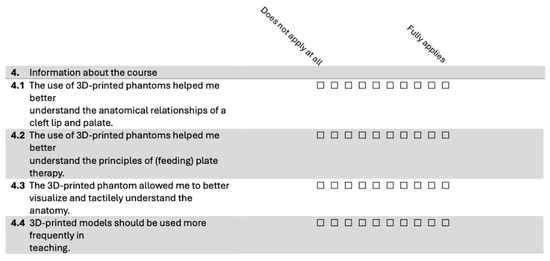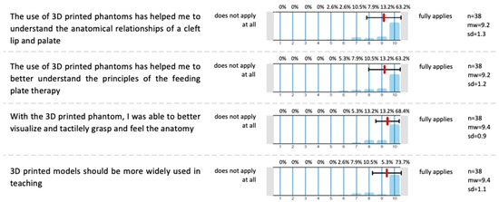 Across all four evaluation items, the median scores ranged from 9.2 to 9.4 on a 10-point Likert scale, with low standard deviations (0.9 to 1.3), indicating a strong consensus among participants. Students agreed that the phantom heads significantly enhanced their understanding of the anatomical relationships in cleft lip and palate (median = 9.2, SD = 1.3) and improved their comprehension of the principles of CLP plate therapy (median = 9.2, SD = 1.2). Additionally, they reported that the models helped them better visualize and tactilely grasp the anatomy (median = 9.4, SD = 0.9). Participants also strongly supported the broader integration of 3D-printed phantoms in teaching (median = 9.4, SD = 1.1). These results demonstrate the seminar’s success in effectively utilizing 3D-printed models to enhance student learning and satisfaction.