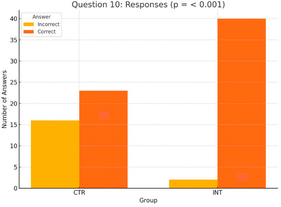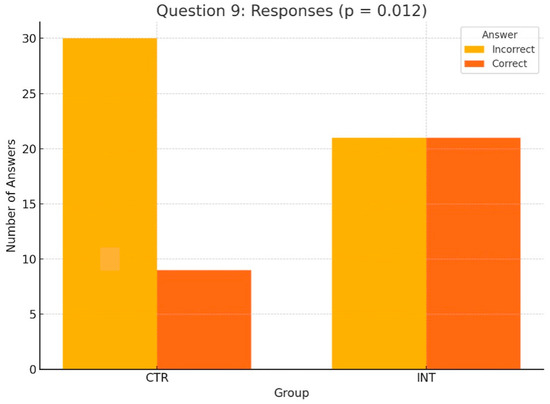 For Question 10 (Figure 6), which assessed students’ understanding of the anatomical peculiarities of a unilateral cleft lip and palate, the INT group significantly outperformed the CTR group, with 40 correct answers compared to 23 (p < 0.001, Wilcoxon test). Similarly, for Question 9 (Figure 7), which evaluated knowledge of feeding plates for cleft lip and palate, the INT group achieved 21 correct responses compared to 9 in the CTR group (p = 0.012, Wilcoxon test).