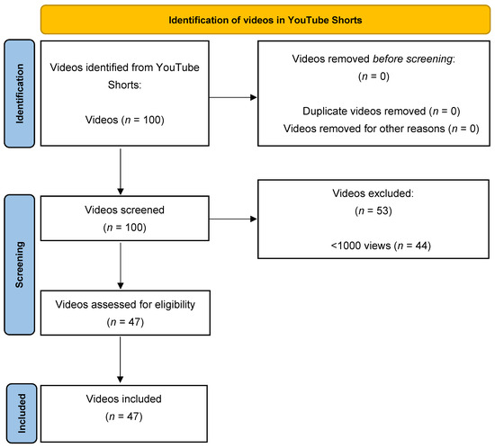 The selection process followed a transparent, staged approach modeled on the PRISMA framework. First, all videos returned by the initial search on YouTube Shorts using the keyword “oil pulling” (n = 100) were identified as potentially relevant content. In the screening phase, titles, thumbnails, and brief descriptions were reviewed to remove clearly irrelevant or duplicate videos, resulting in 23 exclusions. During the eligibility assessment, the full content of the remaining 77 videos was evaluated against the predefined inclusion criteria, which required English language, public accessibility, and a minimum view threshold of 1000 views. Finally, 47 videos that met all criteria were included in the final analysis dataset.