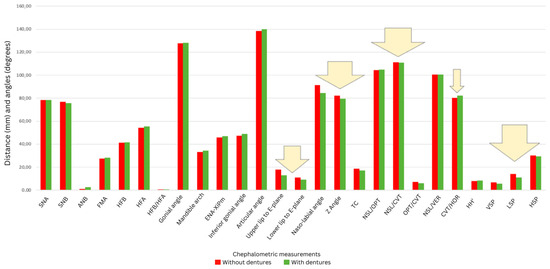 Cephalometric measurements before and after denture placement across skeletal typologies.