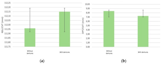 When analyzing the changes in the inclination of the cranial base, the corresponding angles exhibited an increase, indicating cephalic extension. Specifically, the NSL/CVT angle showed a slight increase from 111.96° to 112.15° after the placement of the complete denture (p = 0.90). The OPT/CVT angle showed a decrease after the placement of complete dentures from 8.42° to 7.28°, representing an average attenuation of lordotic curvature of −13.5% when wearing the prosthesis (p = 0.21). A slight increase indicates a trend towards cephalic extension, suggesting compensatory postural adjustments due to changes in vertical dimension and mandibular positioning (Figure 3a). The observed decrease suggests attenuation of cervical lordosis, potentially due to improved mandibular positioning and altered muscular balance post-rehabilitation (Figure 3b).