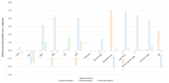 In normodivergent patients, the aim was to maintain normal vertical dimension and aesthetic harmony. Minor changes included a slight reduction in the FMA angle (−0.2°) while ENA-Xi-Pm showed a slight increase.