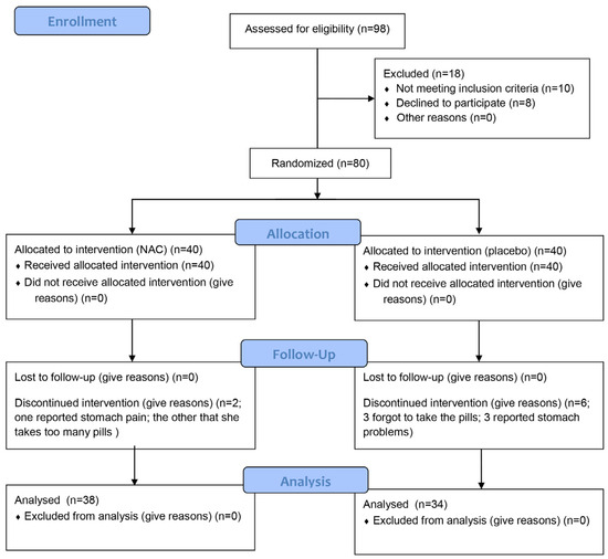The treatment group consisted of 40 randomly selected patients who received N-acetylcysteine at a total daily dose of 1200 milligrams (mg), administered as two 600 mg capsules taken twice daily, in the morning with breakfast and in the evening after dinner, for two months. The control group included 40 patients who received placebo capsules containing starch which were taken the same way. To make the groups more homogeneous, only female patients were included in the study.