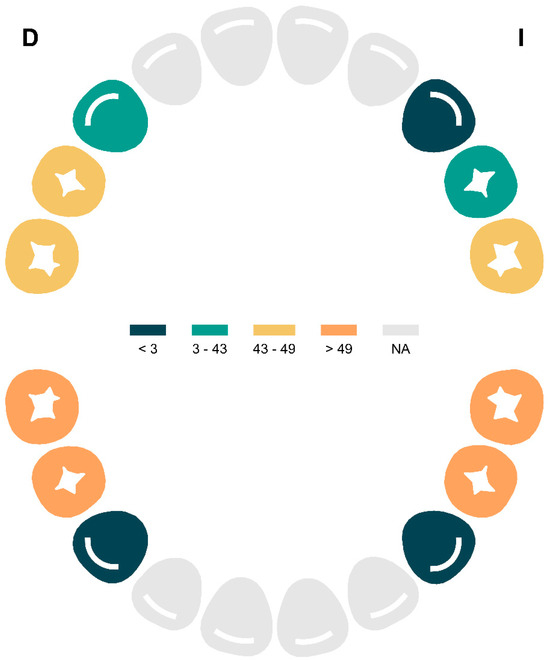 Regarding the permanent dentition, caries involvement was primarily concentrated in the first molars. The most affected teeth were tooth 26 (20 lesions), followed by teeth 36 and 46 (both with 15 lesions), and to a lesser extent, tooth 16 (12 lesions).