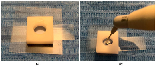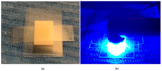 (a,b) The image shows the preparation of specimens for measuring the degree of conversion. A total of four samples were prepared for each tested composite, with measurements taken at two different depths.