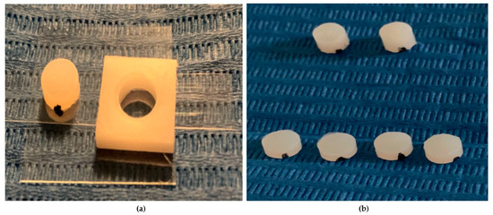 After removing the glass slide, polymerization was performed with the curing tip in contact with the Mylar strip covering the upper surface of each specimen (Figure 3a,b). Once polymerization was obtained, the lower surface was marked with a notch made with a permanent marker (Figure 4a,b). A latest-generation LED light unit (SmartLite Pro®; Dentsply Sirona Inc., New York, NY, USA) was used, which is compatible with the absorption spectrum of SDR®flow+. The unit had an output of 1200 mW/cm2 and a 10 mm diameter active tip, used according to the manufacturer’s recommendations (Table 2). Every four polymerization cycles, the light intensity was checked with a radiometer (C10 Light Meter, Premium Plus, Conservation Support Systems, Santa Barbara, CA, USA), consistently measuring approximately 1200 mW/cm2. All cylindrical specimens were stored dry and away from light for 24 h.