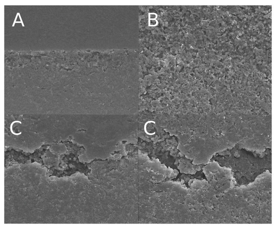 Demineralized dentin, however, represents a major clinical challenge. The partially degraded collagen matrix, increased permeability, and morphological irregularities limit adhesive infiltration and polymerization efficiency. This could explain the higher prevalence of adhesive failures observed in the carious groups, particularly after aging. The loss of bonding effectiveness over time may also be attributed to water sorption, the hydrolytic nature of some adhesive monomers, and enzymatic degradation at the interface [